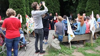 Am Abend wurde dann gegrillt. Dann gab es eine Überraschung: die „Spielleut Ranunkulus“ mit mittelalterlichen Instrumenten und Kleidern sangen und spielten für uns. Natürlich durften alle mitmachen. Zum Abschluss gab es dann einen Umzug, an dem auch „unsere“ Loreley und unsere selbstgestalteten Fahnen teilnahmen.